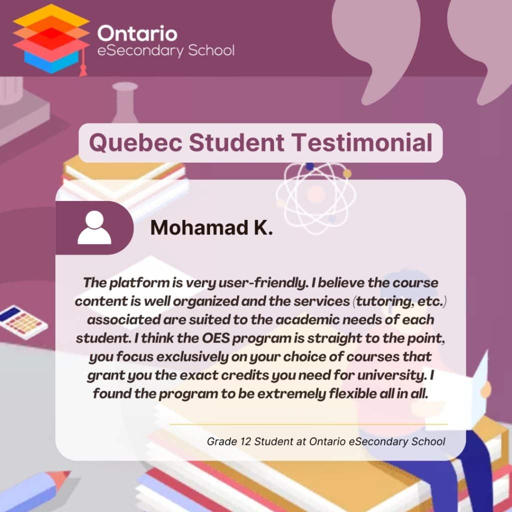 Quebec students may take OES high school courses in order to earn their grade 12 diploma with us as full-time or part-time students. This allows them to work around their schedule and meet course requirements where and when they want.