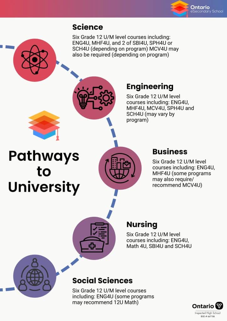 Step 3: Choose your own pathway to meet the remaining requirements. Complete the required courses (~7 U/M and Ontario Literacy Course), 40 hours of community involvement and receive your Ontario Secondary School Diploma (OSSD)!